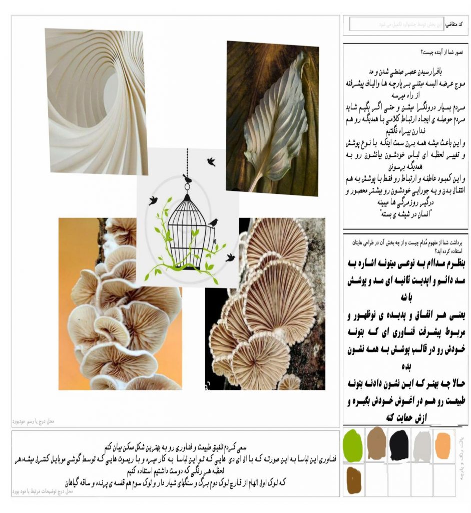 استفاده از تکنولوژی در دسترس و پیچیدگی در طرح لباس قارچی(لوک 1) ارتباطی نسبتاً مناسب با موضوع جشنواره دارد.
