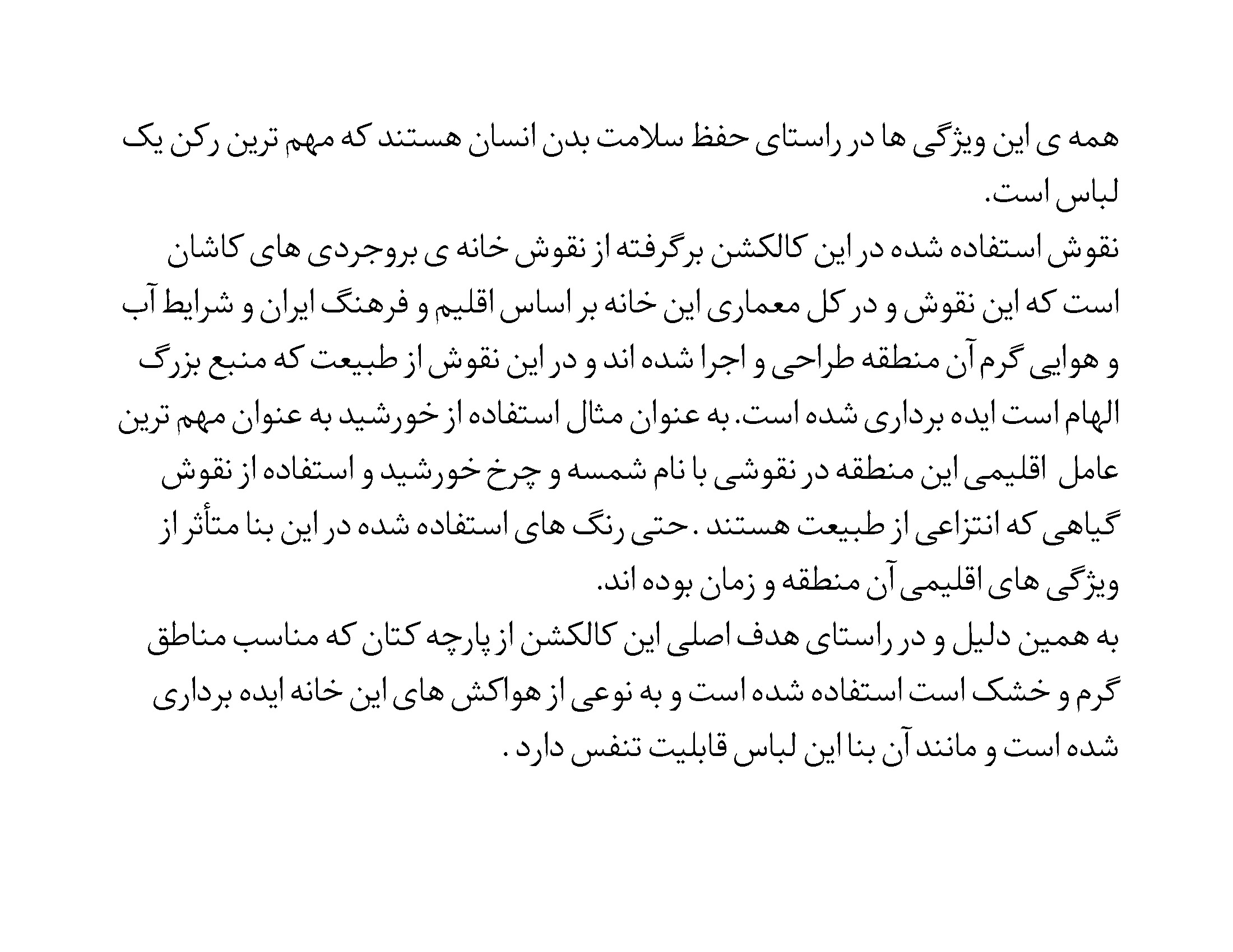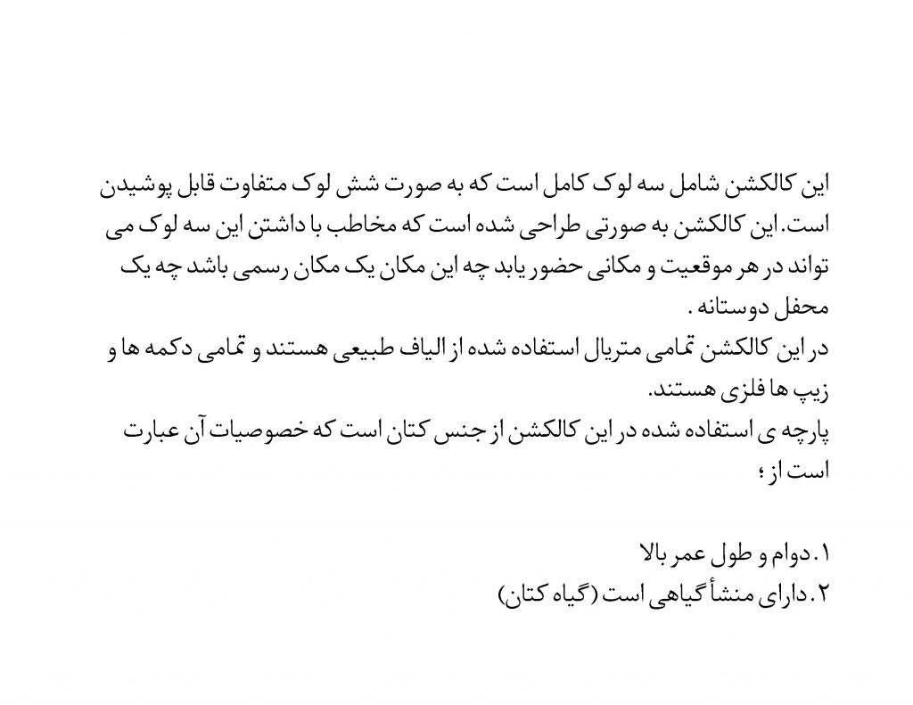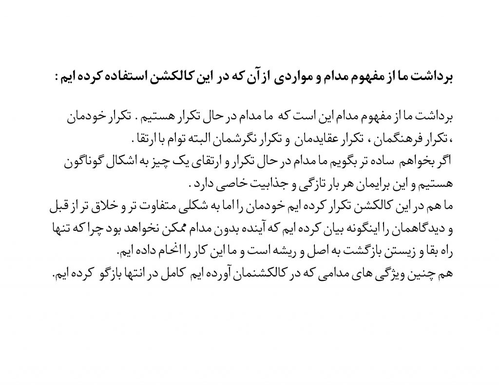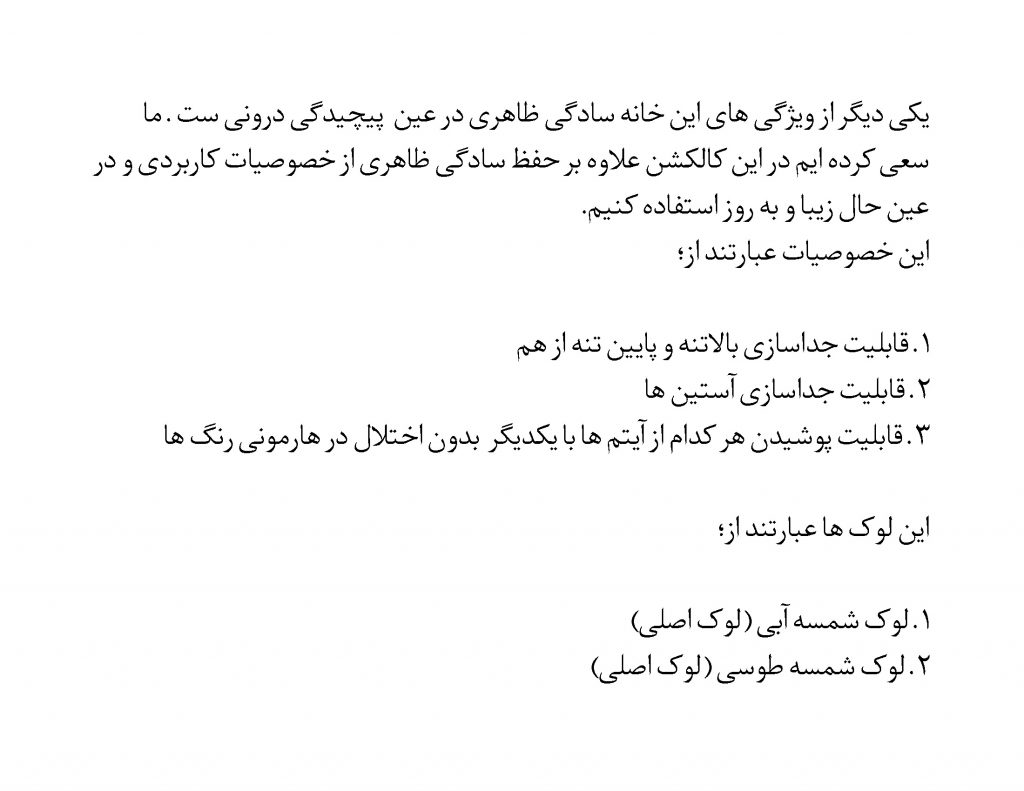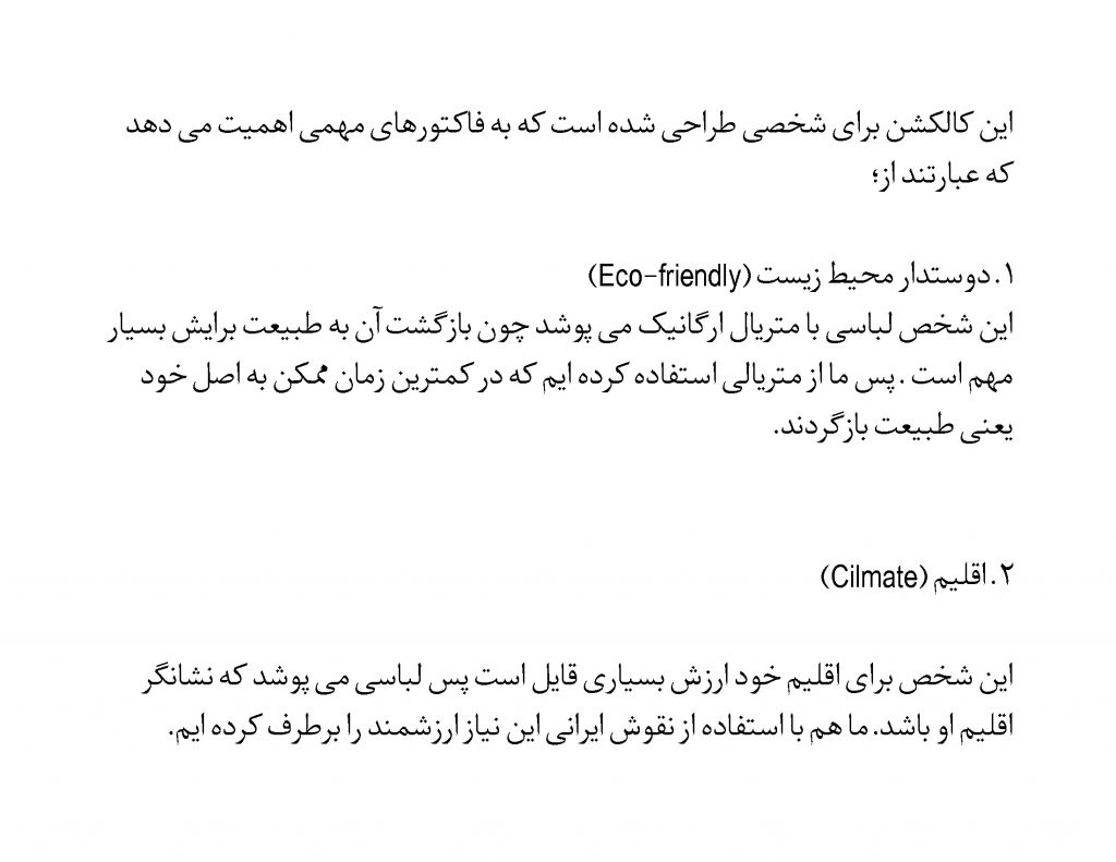 ما در این کالکشن از طبیعت و معماری فلات ایران کمک گرفته ایم و تلاش کردیم به خوبی آن را به اجرا درآوریم .