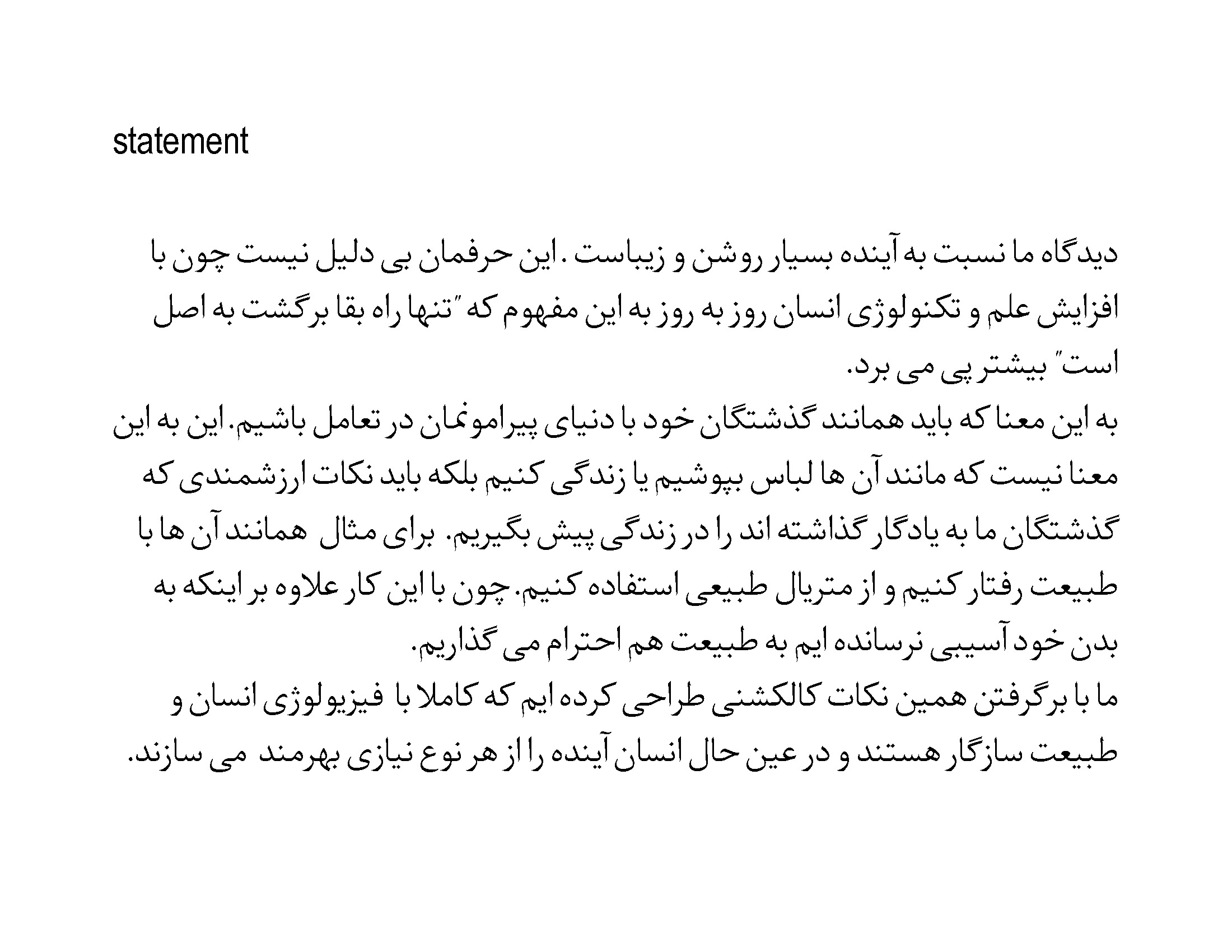 از آنجایی که موضوع این جشنواره آینده ی پوشاک است و با توجه به دغدغه هایی که ما در رابطه با طبیعت و سلامت موجودات زنده داریم ،این جشنواره را بستری مناسب برای انتقال طرز تفکرمان راجع به نحوه ی سازش انسان و طبیعت در حوزه ی پوشاک دانستیم و با وجود زمان کم تمام تلاشمان را برای نشان دادن طرز تفکرمان در این کالکشن گذاشتیم.