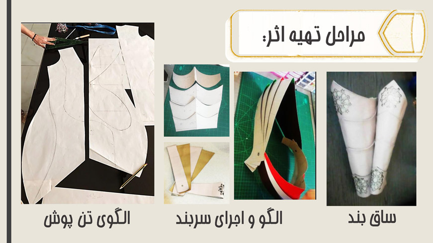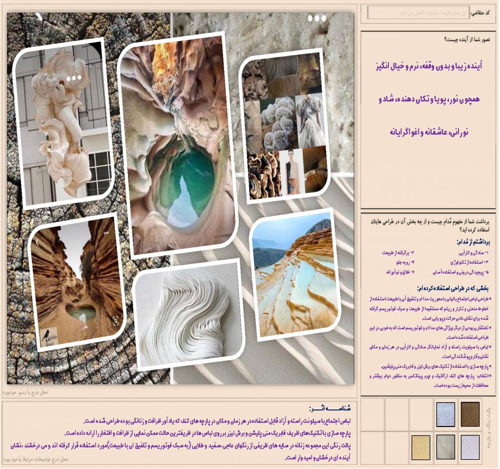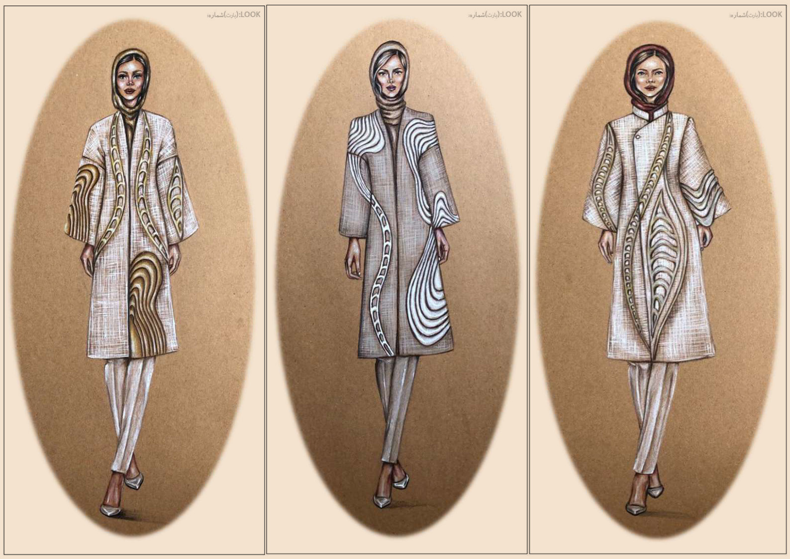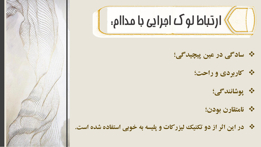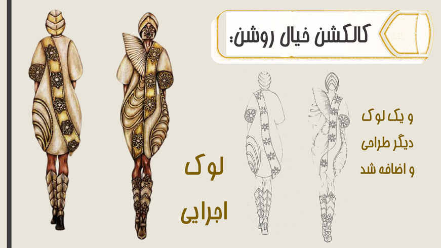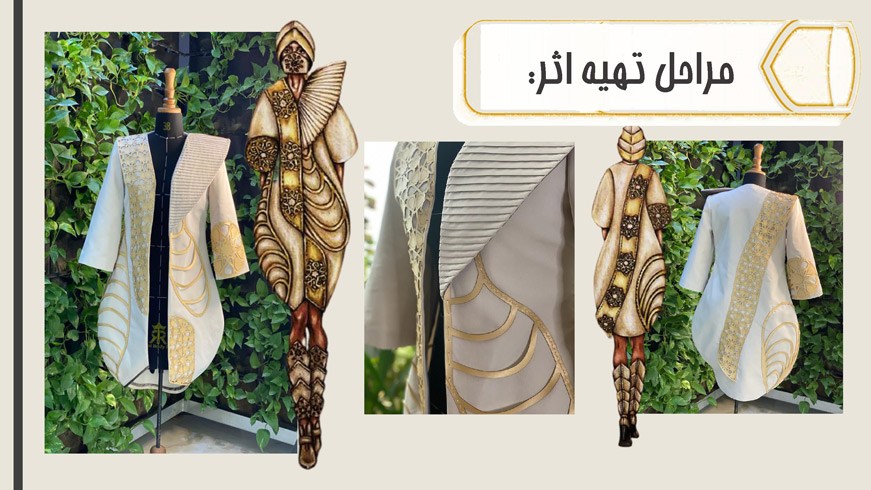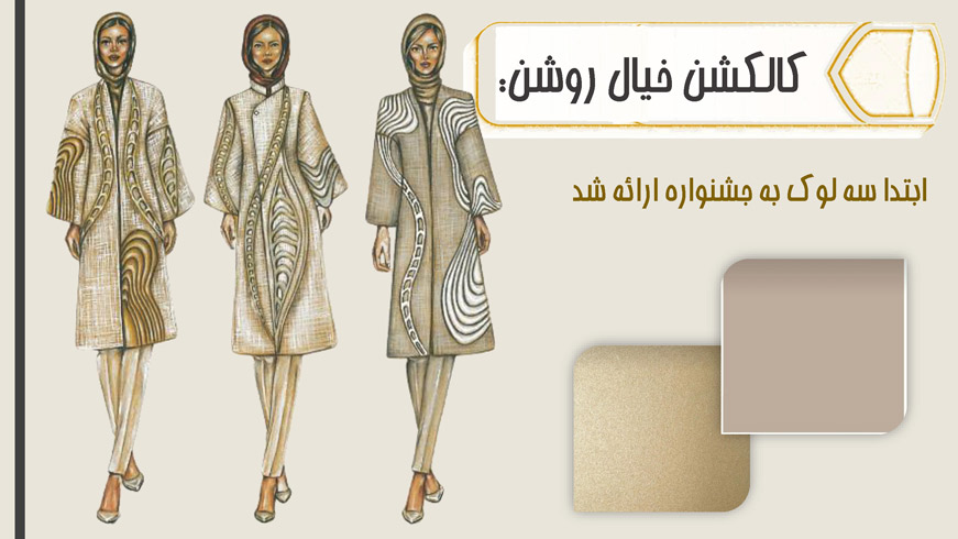 تزیینات باشکوه ایرانی پوششی است اصیل بر تن بانوی آینده، کاربردی بودن لباس اجتماع در عین حال چشم نواز بودن با سیلوییت متفاوت، از ویژگی های مدا ام بوده که در این اثر همواره مورد توجه قرار گرفته است. استفاده از رنگهای روشن و طلایی به عنوان نماینده روشنی و نورو امنیت زمین ،در جهان نمودار گشته است.