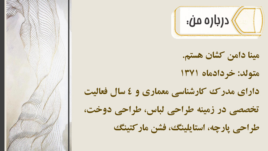 معرفی کوتاهی از خودتان(سن، کجا آموزش دیدهاید،چرا به مُد و طراحی علاقهمندید)