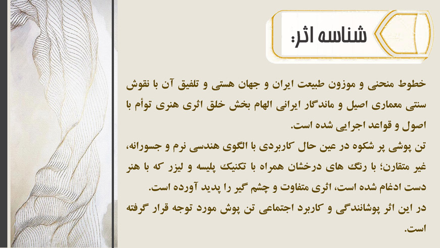 طراحی و اجرای این اثر با الهام از طبیعت و تلفیق آن با نقوش سنتی و ماندگار ایرانی است، خطوط منحنی طبیعت، الهام بخش خلق الگوی خلاقانه و چشمگیر است.