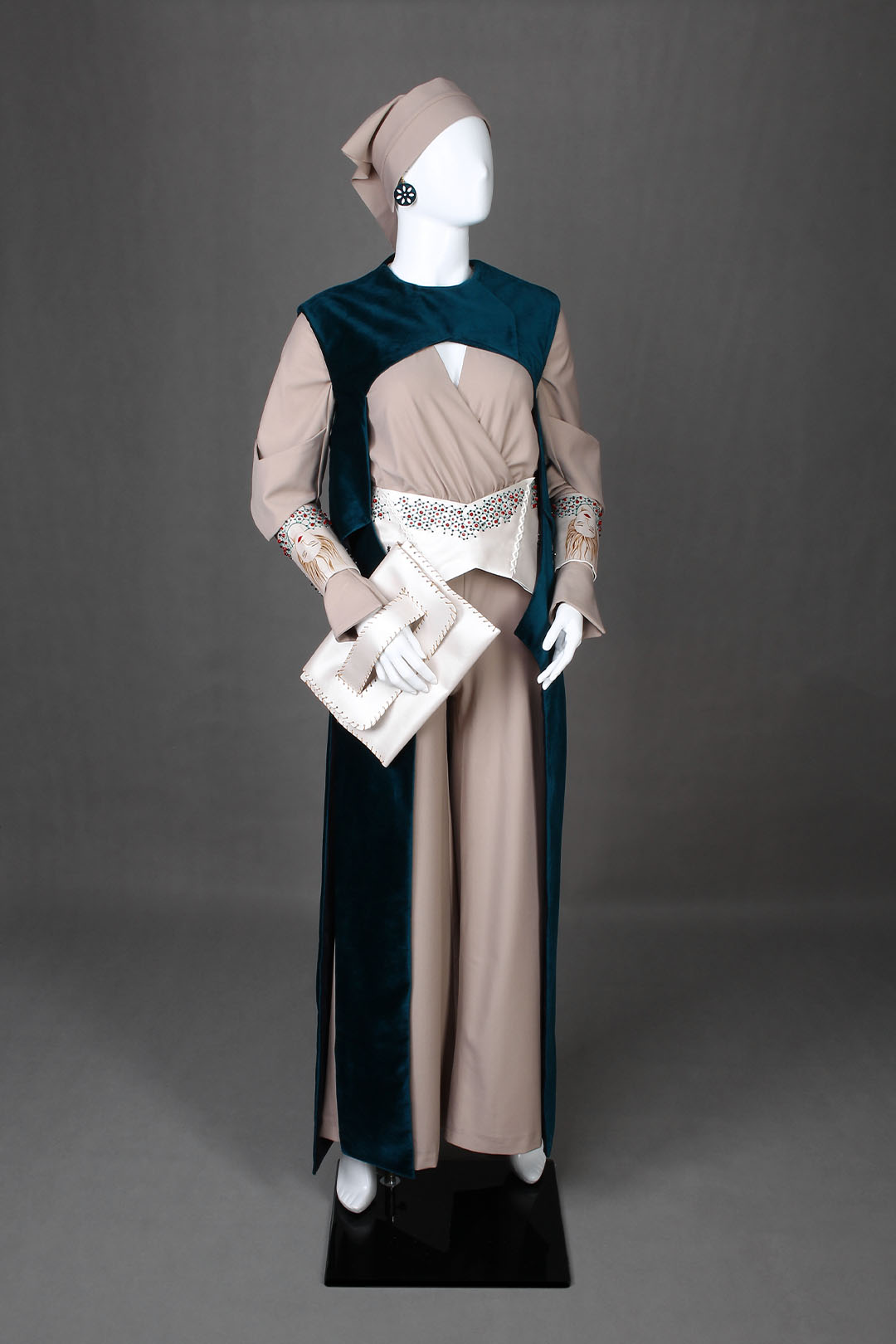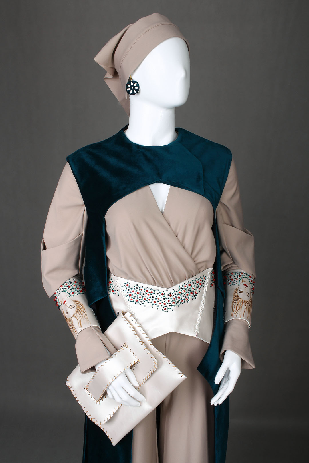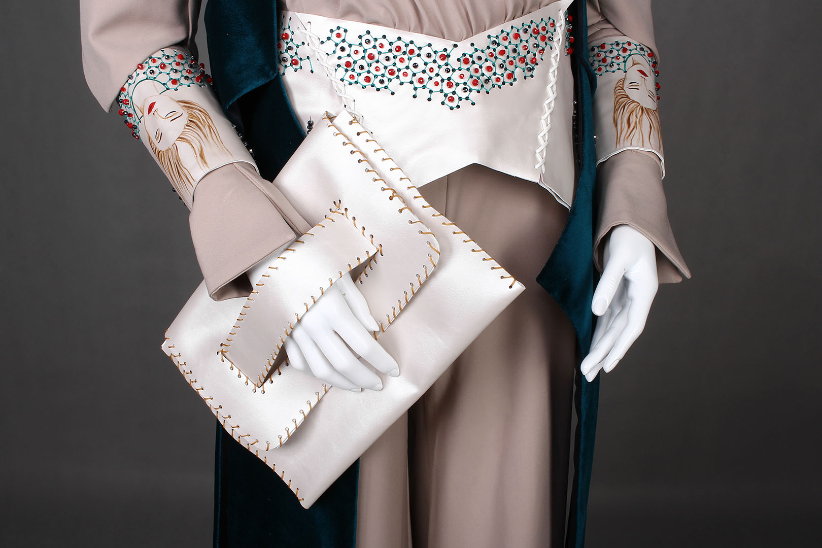 زمانی که طراحی این لباس را شروع کردیم علاوه بر انتقال عشق و دوستی در اینده خواستیم اقلیم خود را هم در این لباس به کار ببریم و گذشته خود را به اینده ببریم عبای این لباس با پارچه مخمل نشان تاج و تختی است که از گذشته سرزمین خود اوردیم و و کمربند و مچ بند ها با پارچه چرم نشان امادگی است که برای رویارویی با اینده داریم و تزینات هم به همین دلیل بر روی بر روی این دو تکه انجام شده و روی ان از مولکول ها ایده گرفته شده و مو های رودابه و لباس سرهمی با برش های تیز در استین نشان هیجان و تنشی است که برای اینده داریم و و چین های کمر که خطوط منحنی راشکل میدهد نشان حرکت و نرمی است که از درون انسان برای سازش با محیط خود میآید.
