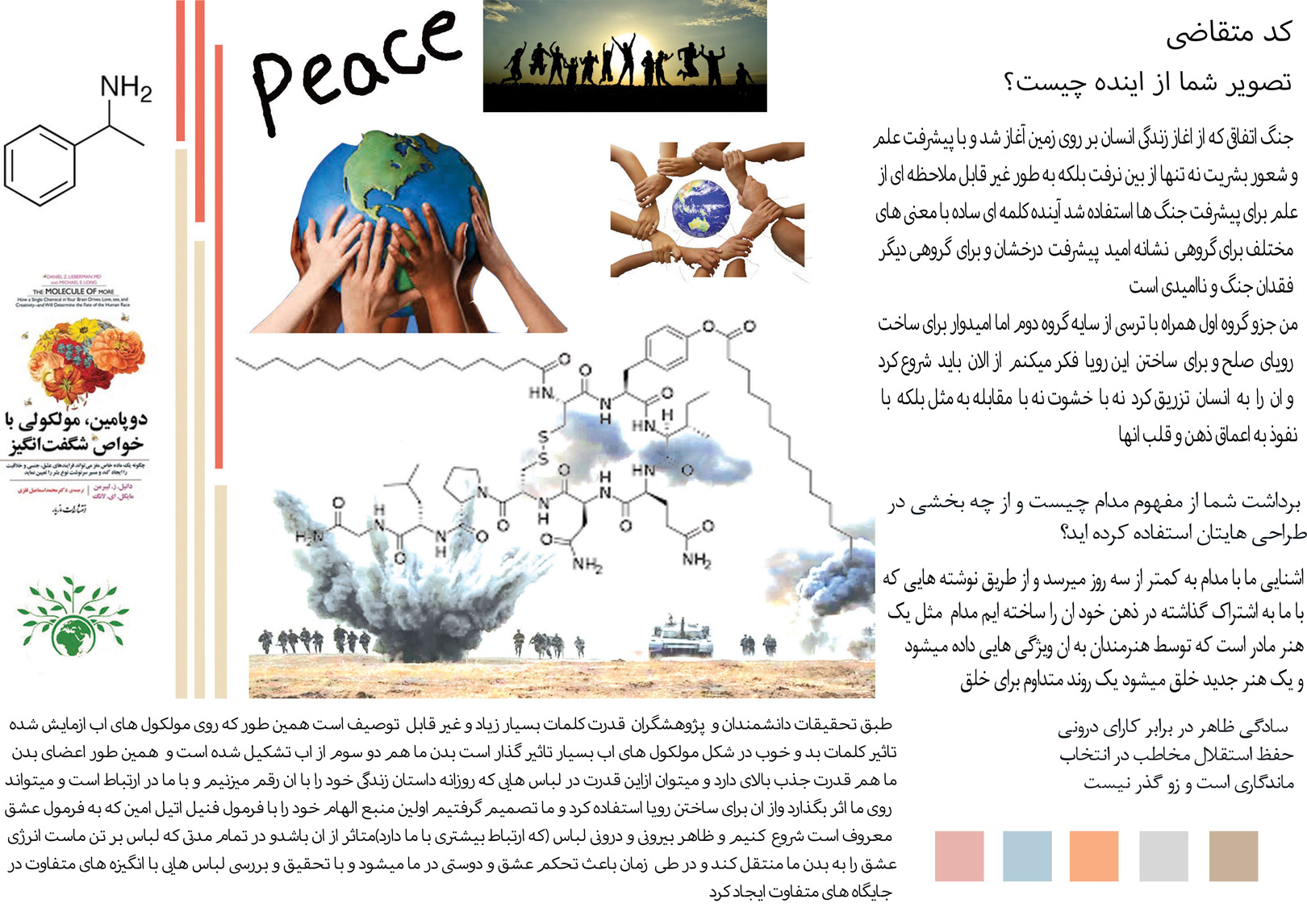 دلیل استفاده ما از این موضوعات برای این بود که در اینده پیش رو با صنعتی شدن زندگی بشر عشق کمتر دیده میشود و زندگی ماشین وارانه ادامه پیدا خواهد کرد ما میخواهیم که با لباس عشق را به فرد القا کنیم و نگذاریم که این موهبت الهی فراموش شود برای همین تصمیم گرفتیم از مولکول عشق استفاده کنیم و ان را با داستان های عاشقانه اقلیمی خود ترکیب کنیم