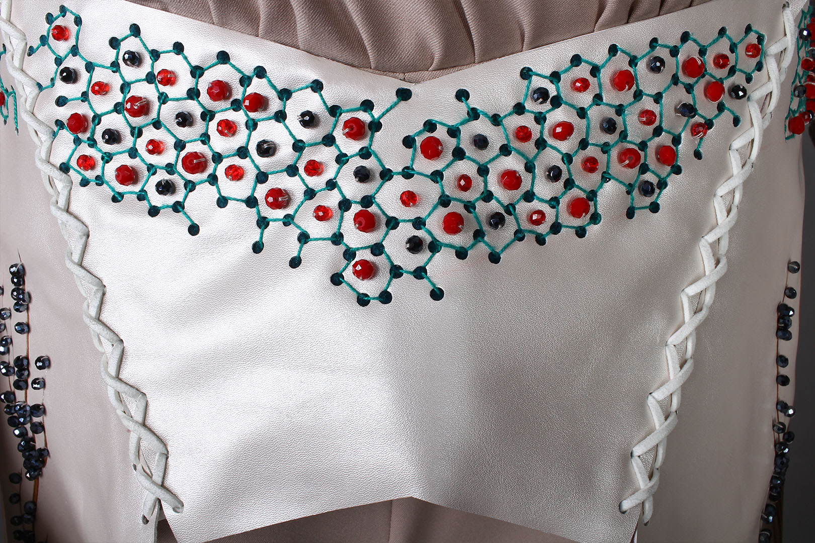 این لوک از ۶ تکه تشکیل شده که هرکدام از تکه ها به صورت جداگانه قابل استفاده است و ترکیب پارچه مخمل و چرم و کرپ است که با توجه به موضوع و تلفیق اقلیمی و مدرن انتخاب شده است و تمام کار انجام شده روی تزینات چرم کار دست بوده و حاصل تفکر تیمی است و با توجه به شرایط سخت حال حاضر گروه در کنار هم جمع شده و در زمان محدود این لوک را اماده کرده است.